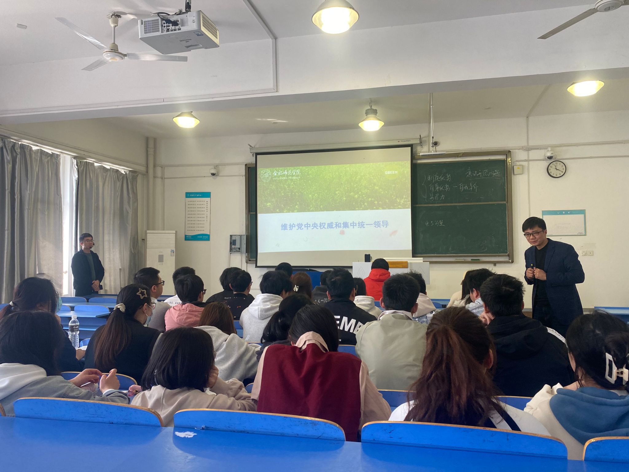 在逸夫楼A407教室,郝嘉乐老师用“请你谈谈,人民群众支持与拥护中国共产党的事例”导入,运用大量鲜活的员工身边事例、典型案例、红色故事,生动阐释“坚持党对一切工作的领导”重大意义,深入分析“党的领导是全面的、系统的、整体的”。紧接着,张军占又从理论、历史、现实三重逻辑全面分析“维护党中央权威和集中统一领导”是历史和人民的选择,是提高国家治理科学决策的最有效原则。同时引导青年老员工爱党爱国,自觉地拥护“两个确立”、做到“两个维护”。
