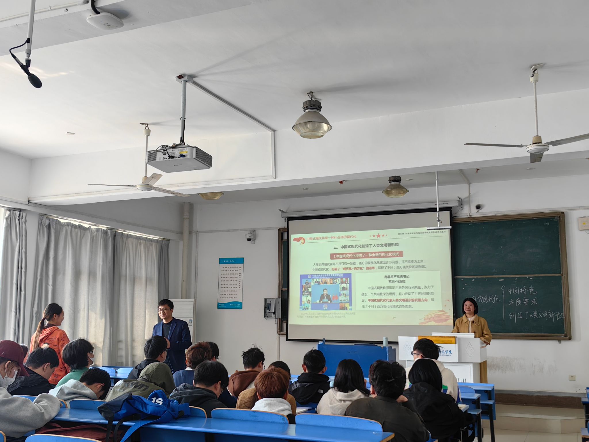 在逸夫楼A406教室,首先由蒋娟老师以问题式导入本节专题“中国式现代化是强国建设和民族复兴的唯一正确道路”。蒋娟以员工为主体,以问题为导向,通过问题链分析阐释中国式现代化的中国特色和本质要求。她以视频方式引入“为什么说中国式现代化创造了人类文明新形态?”随后,教研室主任张军占老师从人类文明新形态的内涵,人类文明新形态“新”在哪里?运用对比的方式,分析中国式现代化是一种全新的现代化模式、是对西方式现代化理论与实践的重大超越、是人类现代化道路的全新选择。