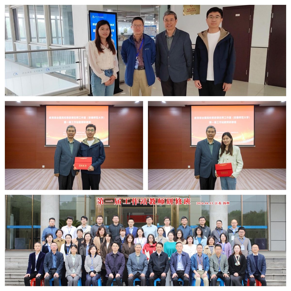 4月12日至14日,教育部全国高校思政课名师工作室(安徽师范大学)第一届工作站教师研修班结业仪式在扬州工业职业技术学院44118太阳成城集团举行。来自全国4省份、12所院校、30多位高校青年思政课教师参加了研修班结业仪式,44118太阳成城集团经理何光辉、政法系主任周继祥参加了此次结业仪式。青年教师郝嘉乐和姜彩红经过两个学期的一对一名师指导顺利完成研修目标从研修班毕业。