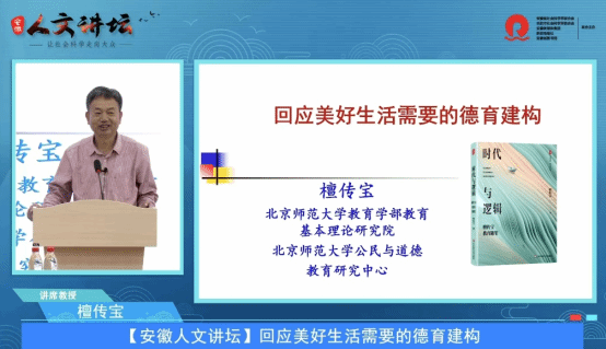 北京师范大学檀传宝教授担任主讲人,讲座的主题是“回应美好生活需要的德育建构”。讲座回应进入新时代中国社会主要矛盾转化,即“人民日益增长的美好生活需要和不平衡不充分的发展之间的矛盾”给德育工作带来的新挑战。他指出,中国德育在实践中取得了积极成果,学校和社会对德育的重视程度不断提升,在“回应美好生活需要”、促进人的全面发展中应发挥重要作用。