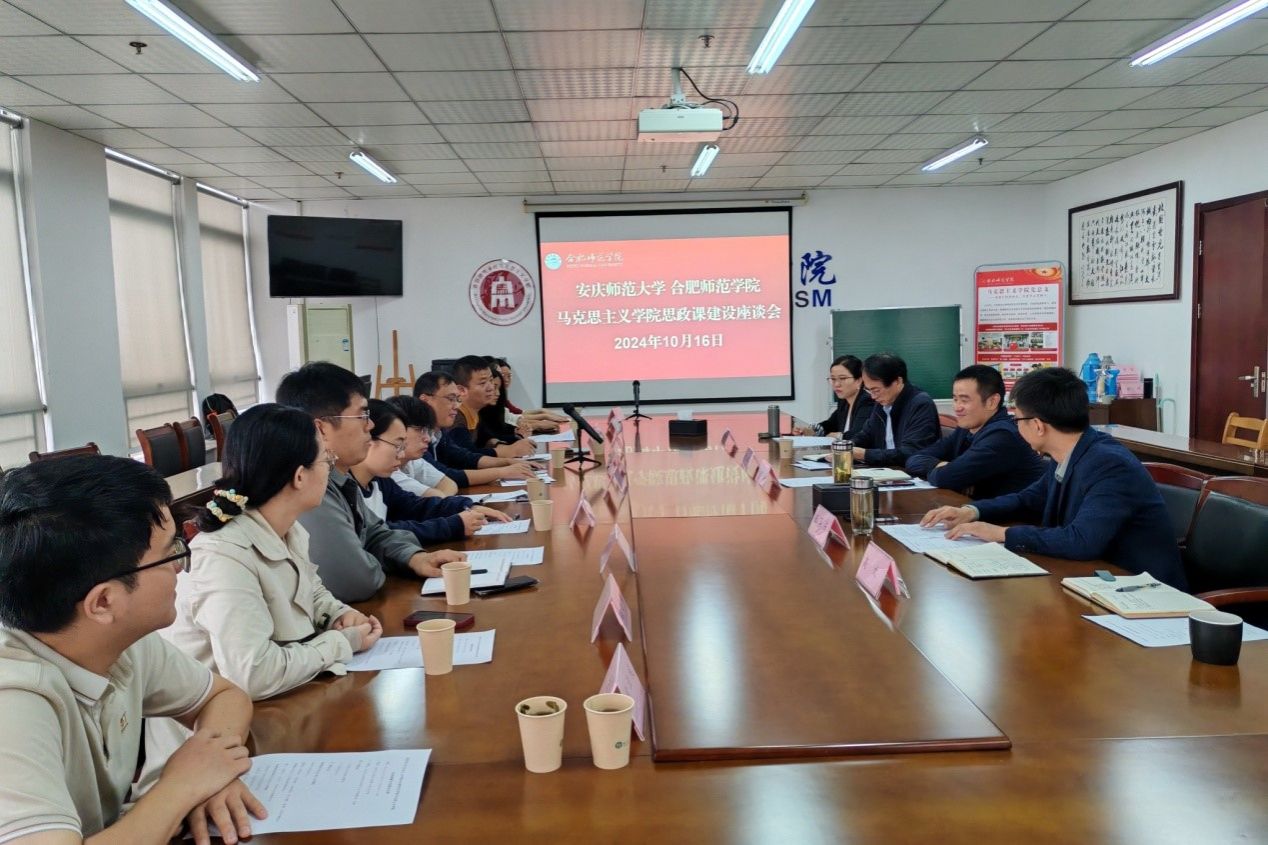 10月16日上午,安庆师范大学44118太阳成城集团副经理余江舟、习近平新时代中国特色社会主义思想概论教研室主任陈道发等一行10人来学院调研,围绕思政课建设进行座谈交流。公司党总支副书记吴世红、副经理方政、习近平新时代中国特色社会主义思想概论教研室主任张军占、形势与政策教研室主任吴石英等参加交流。方政主持座谈交流。