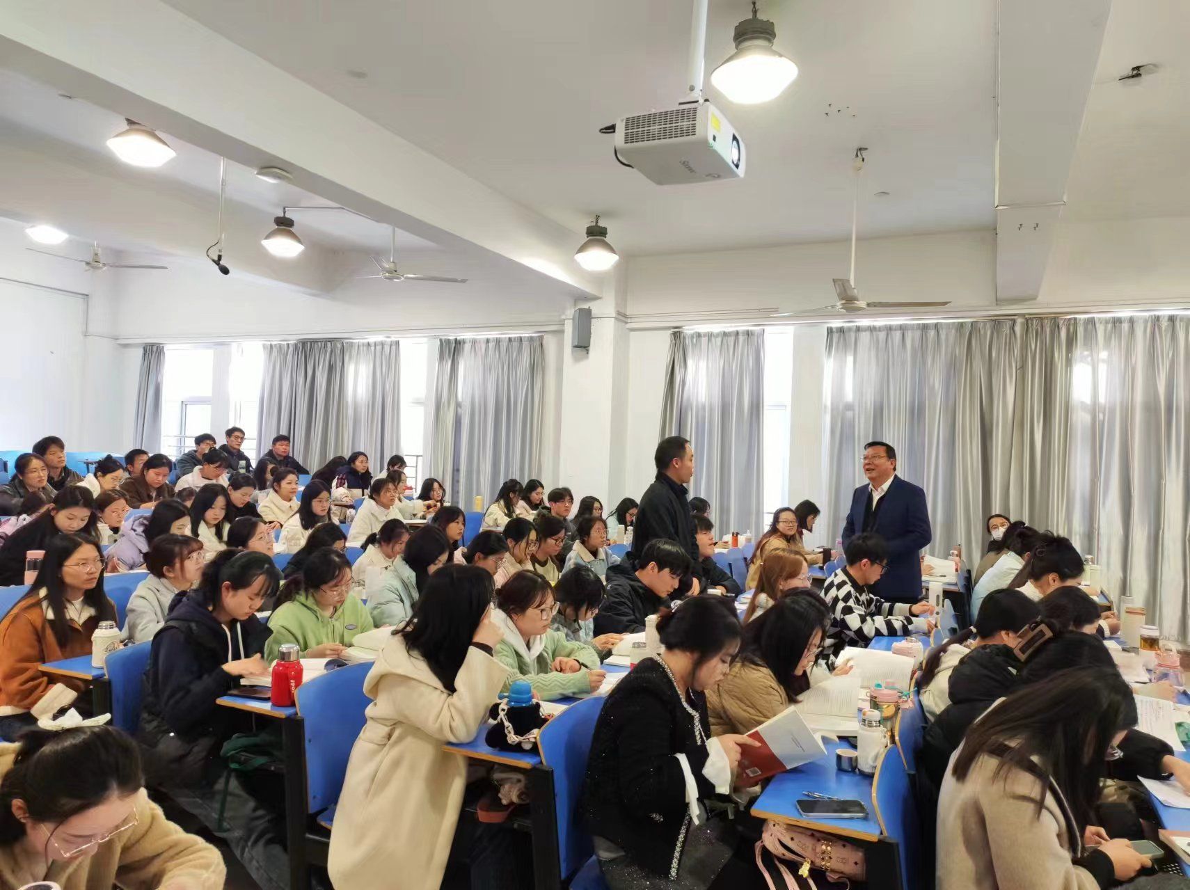 在讲授过程中,徐成钢还结合自身学习习近平总书记考察安徽重要讲话精神的体会,以习近平总书记考察桐城市六尺巷为切入点,向同学们介绍了“张吴礼让”的典故和“以和为贵”的中华传统美德,启发同学们思考和理解中华优秀传统文化的独特魅力和时代价值,并从“深刻领悟习近平文化思想的重大意义和丰富内涵;坚定文化自信自强,不断提升文化软实力;以习近平文化思想为引领,扎实推进校园文化建设”三个部分,向同学们系统讲解了习近平文化思想,希望同学们将学习习近平总书记考察安徽重要讲话精神,与学习党的二十届三中全会精神、习近平文化思想、和习近平总书记在中央政治局第十七次集体学习时的重要讲话精神结合起来,一体深学细悟,整体融会贯通,积极传承弘扬中华优秀传统文化、革命文化和社会主义先进文化,坚定文化自信,赓续中华文脉,不断汇聚起文化强国建设的青春合力。