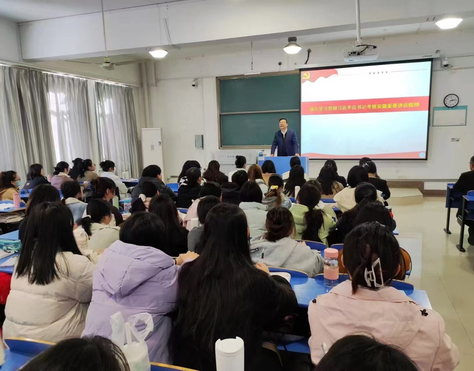为深入学习宣传贯彻习近平总书记考察安徽重要讲话精神,认真落实“领导干部上思政课”工作要求,11月21日上午和11月29日下午,党委书记徐成钢分别走进本科生和研究生思政课堂,结合讲授《习近平新时代中国特色社会主义思想概论》内容,为同学们宣讲习近平总书记考察安徽重要讲话精神,推动习近平总书记重要讲话精神在青年员工中入脑入心。