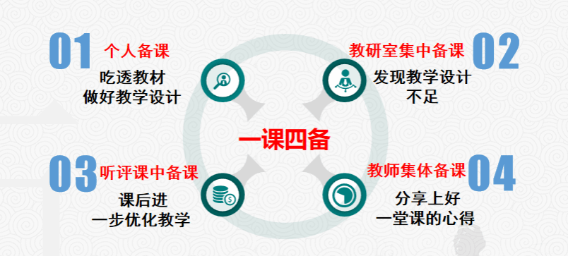 “一课四备”是将教师个人备课(研读教材,厘清学习重难点,做好教学设计)、教研室集中备课(集中研讨,集思广益,发现教学设计的不足)、在听评课中备课(有针对性听课,课后评议,进一步优化教学)、全体教师集体备课(分享“如何上好一堂课”心得)等不同备课形式结合起来,较好地解决了教学针对性问题,有力地促进了课堂教学质量提升。