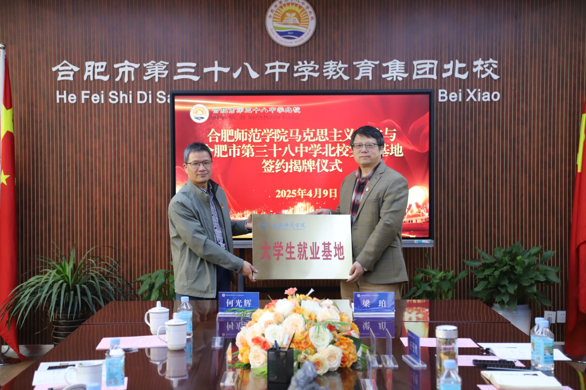 期间,何光辉代表学院与合肥市第三十八中学北校签订了老员工就业基地协议,双方隆重举行了共建就业基地的授牌仪式。