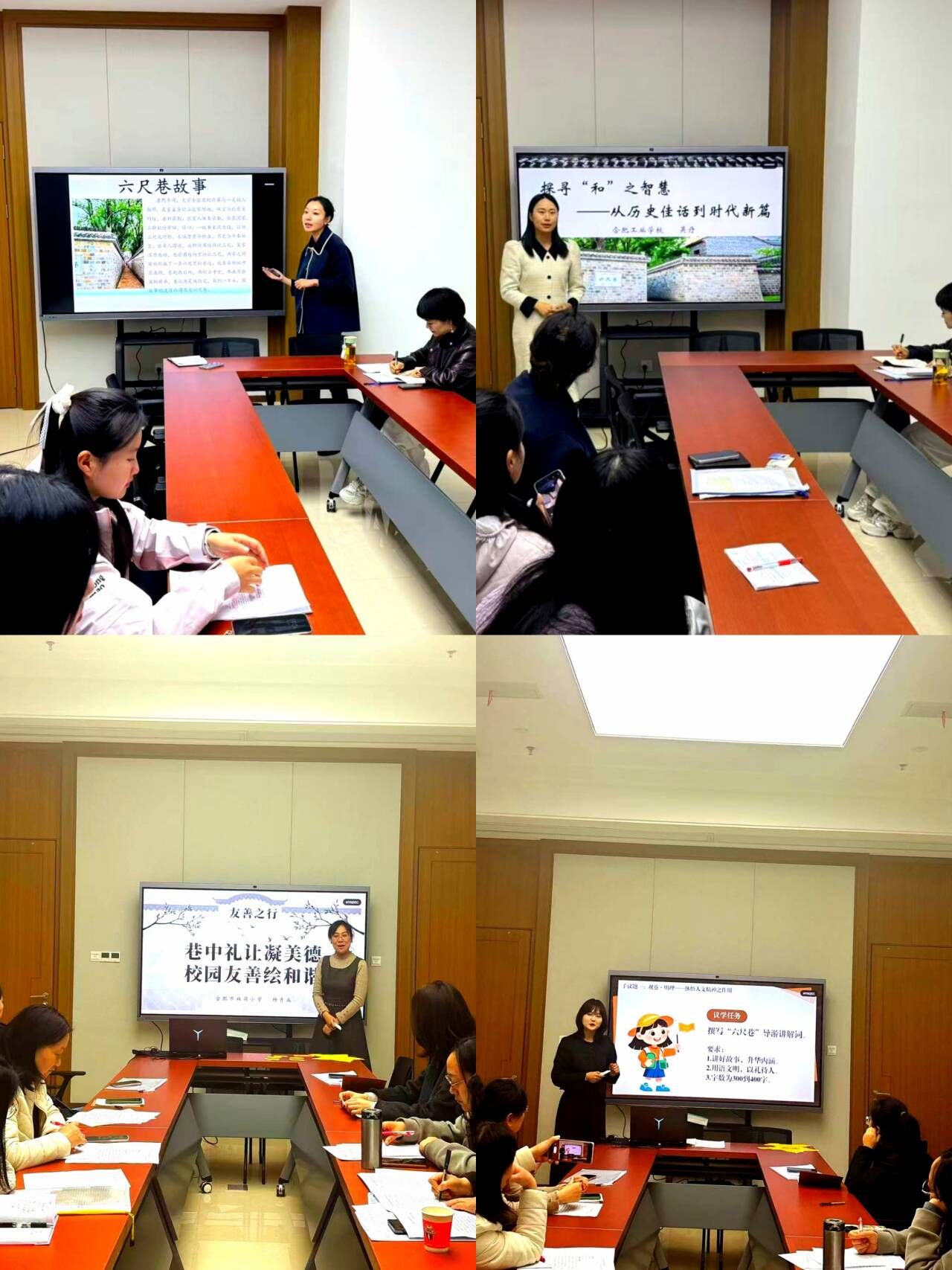 15日上午,研修从课堂走向实景。老师们首先来到桐城市六尺巷及历史文化展陈馆,开启“六尺礼让 懿德流芳”主题研学。在讲解员的生动讲解下,大家驻足“一纸书来只为墙,让他三尺又何妨”的典故展板前,细品六尺巷背后“礼让为先”的中华传统美德;漫步青砖黛瓦的巷弄间,触摸历史遗存中蕴含的人文温度;在历史文化展陈馆内,通过文物、图片、影像等资料,深入了解桐城文化的传承脉络与“礼让”精神的时代价值。学员们不时停步记录、交流感悟,纷纷表示“置身六尺巷,比课堂讲授更能直观体会‘和为贵’的精神内核,这为今后思政课教学提供了鲜活的实践场景。”