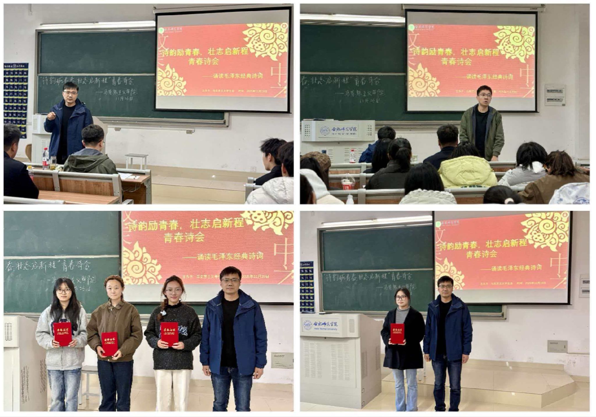 张军占、郝嘉乐在点评时指出,此次活动实现了诗词文化与思想政治教育的深度融合,打造了一堂沉浸式、体验式的思政实践课;不仅展现了同学们的巧思创意与扎实准备,彰显了学子对毛泽东诗词的深刻理解与对革命精神的精准把握,更融入了新时代青年的独特视角,体现出深厚的人文素养与鲜明的思想底色。希望同学们以诗会为契机,通过深度阅读进一步挖掘革命历史内涵,汲取精神养分。