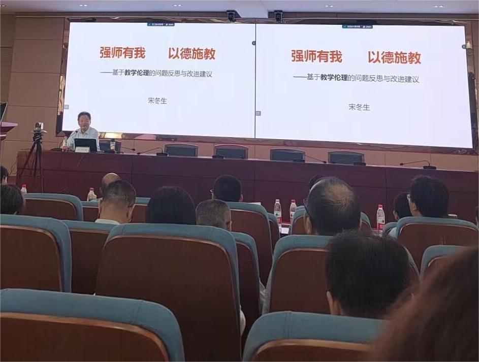 本网讯 7月3日上午,学校在锦绣校区学术报告厅举办师德师风专题报告会。首届全国师德师风建设专家委员会委员,全国优秀教师宋冬生教授以《强师有我,以德施教》为题,从以德施教的视角切入,娓娓道来,饱含深情,通过教育伦理地深入剖析,讲述了一名好老师“道德地教”所具备的能力素质要求,“教以道德”所要求师德内涵,以一名老教师的身份向全体教师发出了“一座学桥、一盏暖灯、一把公尺”的倡议。”44118太阳成城集团全体教师通过线上线下的方式参加了本次报告会。