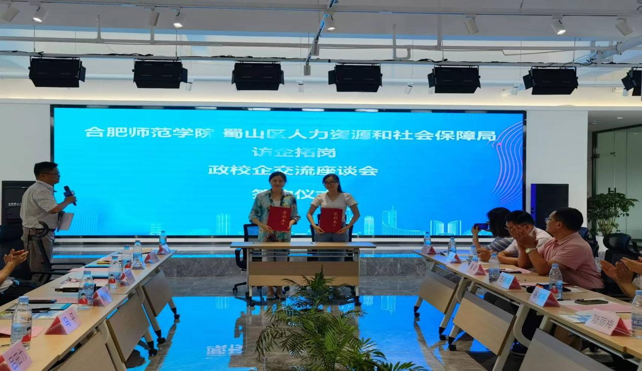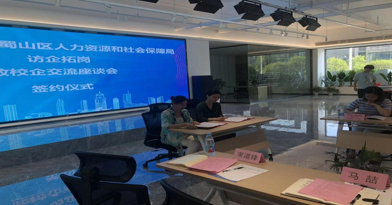 座谈会上,合肥市蜀山区人力资源和社会保障局局长谷和亮首先对周端明一行的到来表示热烈欢迎。他详细介绍了合肥蜀山人力资源服务产业园的服务功能、在促进就业工作方面所采取的措施以及取得的成效,并对公司的办学质量给予了高度评价。周端明对肥市蜀山区人力资源和社会保障局局长谷和亮、党组成员陆丽梅、蜀山区教育体育局党委委员王晓春以及企业代表的热情接待及为公司毕业生提供良好就业岗位表示感谢。他介绍了学校的总体发展、专业建设、人才培养情况以及毕业生就业创业等工作。他指出,这次来到合肥蜀山人力资源服务产业园既要完成访企拓岗的数量要求,更注重通过访企拓岗所带来的实际效果。四家企业代表简要介绍了其企业的规模、定位、员工的薪酬情况并对校企今后的合作提出了设想。