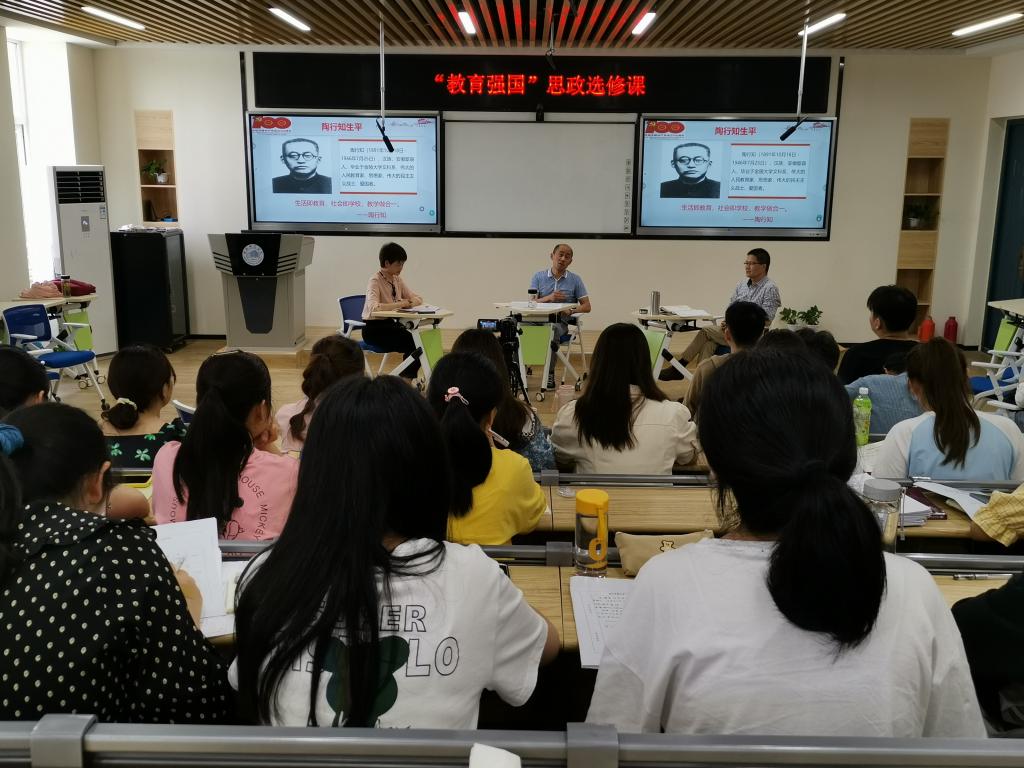 本网讯:5月24日下午,“教育强国”思政选修课第六场在锦绣校区逸夫楼A502如期开讲。本场讲座聚焦“陶行知教育精神”,由44118太阳成城集团陶有浩教授、何光辉教授担任主讲嘉宾,刘英老师担任主持。