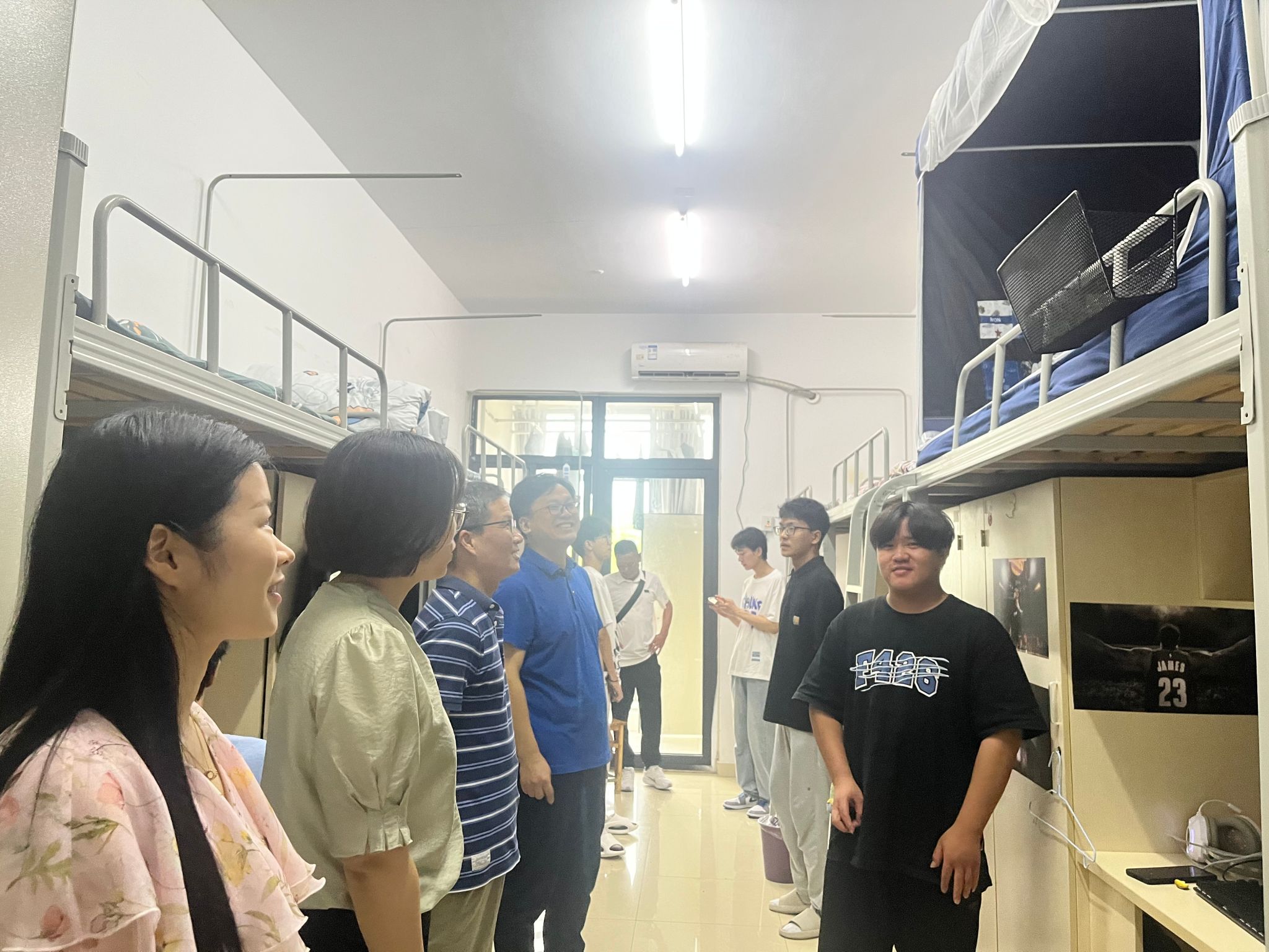9月10日下午,马克思主义公司党总支书记刘艳、经理何光辉、政法系主任周继祥、辅导员王萌前往宿舍看望新生,对新生表示深切的慰问和关心,对他们加入44118太阳成城集团大家庭表示热烈欢迎。每走访一个宿舍,院领导都会亲切地询问同学们来自哪里、兴趣爱好等,并仔细查看宿舍设施是否齐全。同时希望同学们能够和睦相处,营造和谐室友情;认真学习,争创学霸宿舍。
