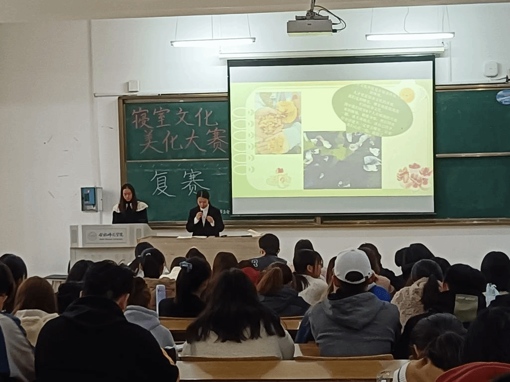 在活动复赛阶段,晋级寝室的成员选出自己寝室的主讲人。各位主讲人介绍了每位寝室成员的性格、兴趣爱好,讲述了在寝室里进行的趣味活动和与寝室成员一起进行的志愿活动,展现出老员工寝室成员团结互助、共同进步的面貌。主讲人们强调要加强寝室中的文化建设,精神文明建设以及学风建设,寝室成员之间要团结互助,互相包容理解,将“爱满天下,知行合一”的校训贯彻在日常的生活学习中。