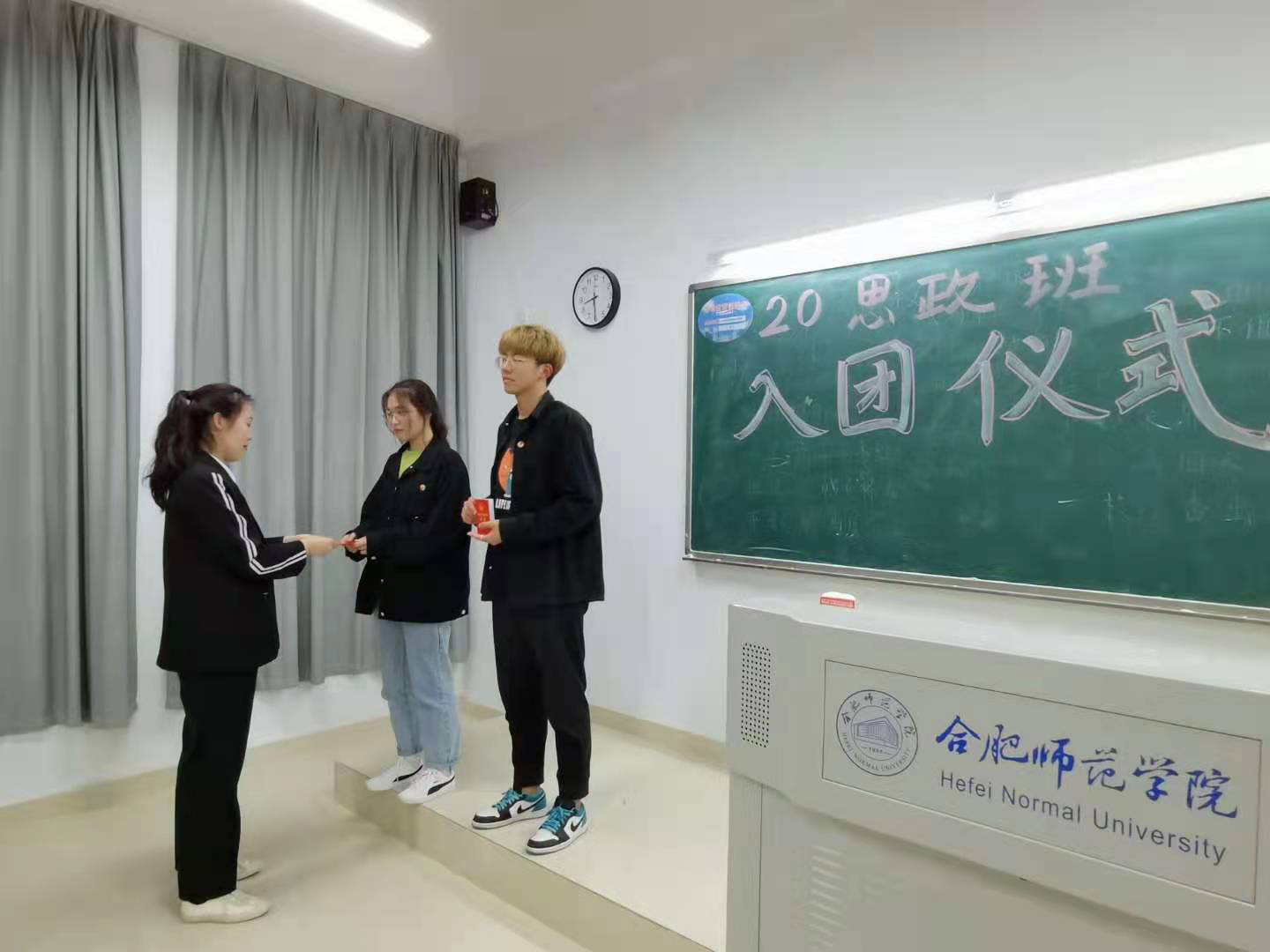 在庄严的国歌声和团歌声中本次新团员入团宣誓仪式正式开始,20级团支书周越宣读新团员的名单,本期共有宋俊杰和杨洁两位同学加入团组织。随后周越为新团员佩戴团徽。在主持人计大宇的领誓下,各位新团员面向团旗、右手握拳举过肩,在团旗下庄严宣誓“我志愿加入中国共产主义青年团,坚决拥护中国共产党的领导,遵守团的章程,执行团的决议,履行团员的义务…”宣誓完毕后,由新老团员分别上台发言,新团员宋俊杰表示自己要立志做一名优秀的共青团员,努力学习,做品学兼优的好员工,以优异的成绩回报老师、回报学校、回报祖国、回报社会。