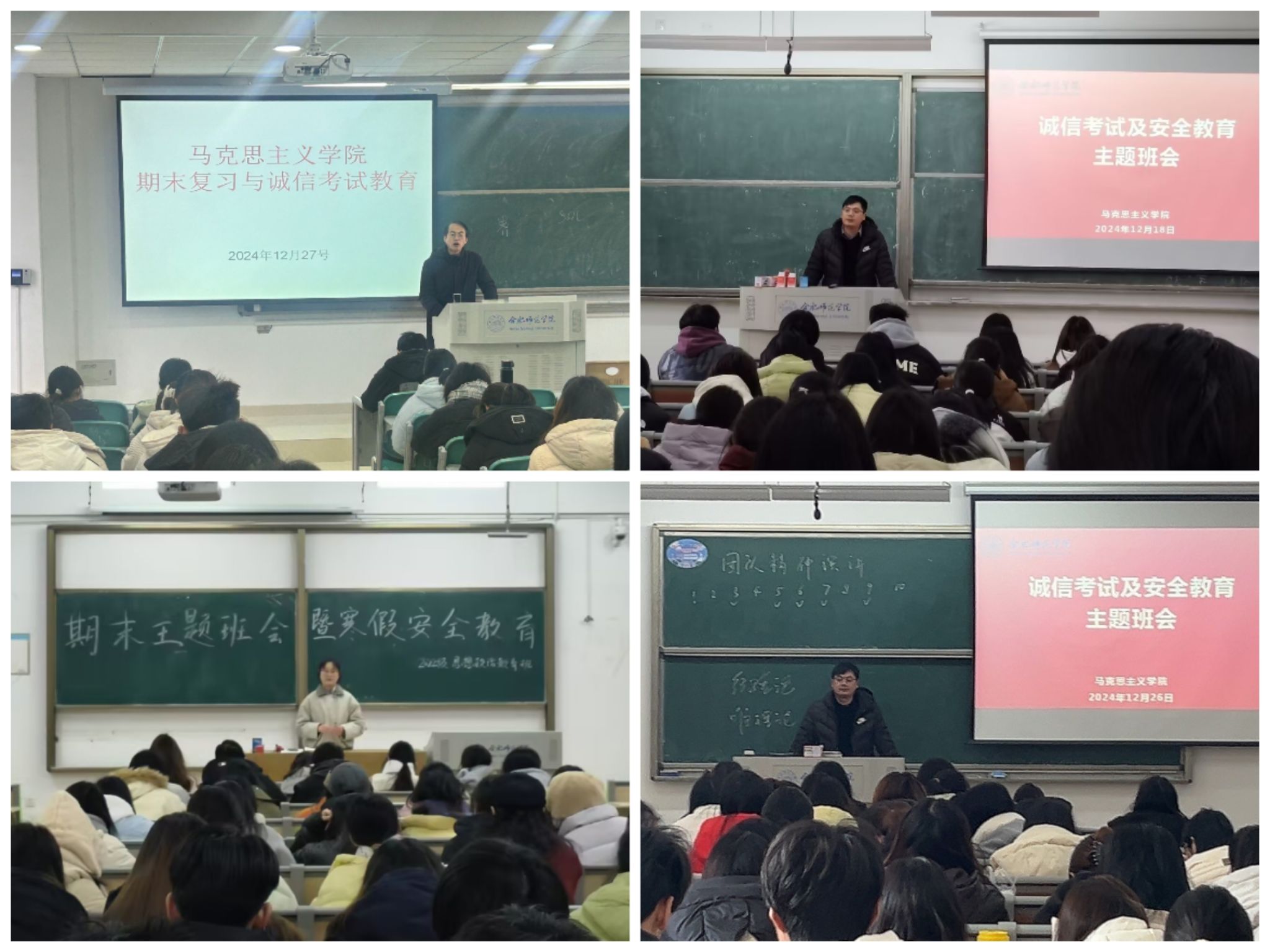12月27日上午,学院在滨湖校区博学楼A203开展期末复习与诚信考试教育,并组织签订诚信考试承诺书。副经理方政与2023级、2024级思想政治教育专业200余名员工参加了本次活动。方政指出,学校高度重视学风建设,将2024年确立为“学风建设年”,考风是学风建设的重要抓手之一,希望同学们端正考风,严肃考纪,考出水平,考出风格。方政还与同学们交流了课程期末考试复习体会,强调期末复习不仅要识记课程基础知识与理论,还要注重总结与掌握课程整体逻辑与线索,强化对课程理论的理解,培育自身运用课程理论分析与解决问题的能力。