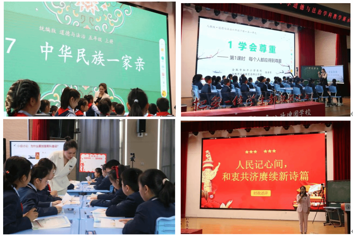 合肥一六八玫瑰园学校夏飞雪老师、合肥市和平小学东校陈秀琴老师、合肥市奥体小学何子皿老师、肥东县宝翠园小学苏海艳老师分别执教道德与法治课五年级上册第七课《中华民族一家亲》、六年级上册第一课《学会尊重》《习近平新时代中国特色社会主义思想员工读本》(小学高年级)第12讲《强国必须强军》、时政述评《人民记心间,和衷共济赓续新诗篇》,四位老师精神饱满,知识讲解中重视启发员工问题探究的多维思考,学理阐释中重视对员工进行正确政治方向和价值观念的引领,较好地体现了思政课是落实立德树人根本任务的关键课程,以“皖美”诠释了思政课的课堂模样和改革创新取向。