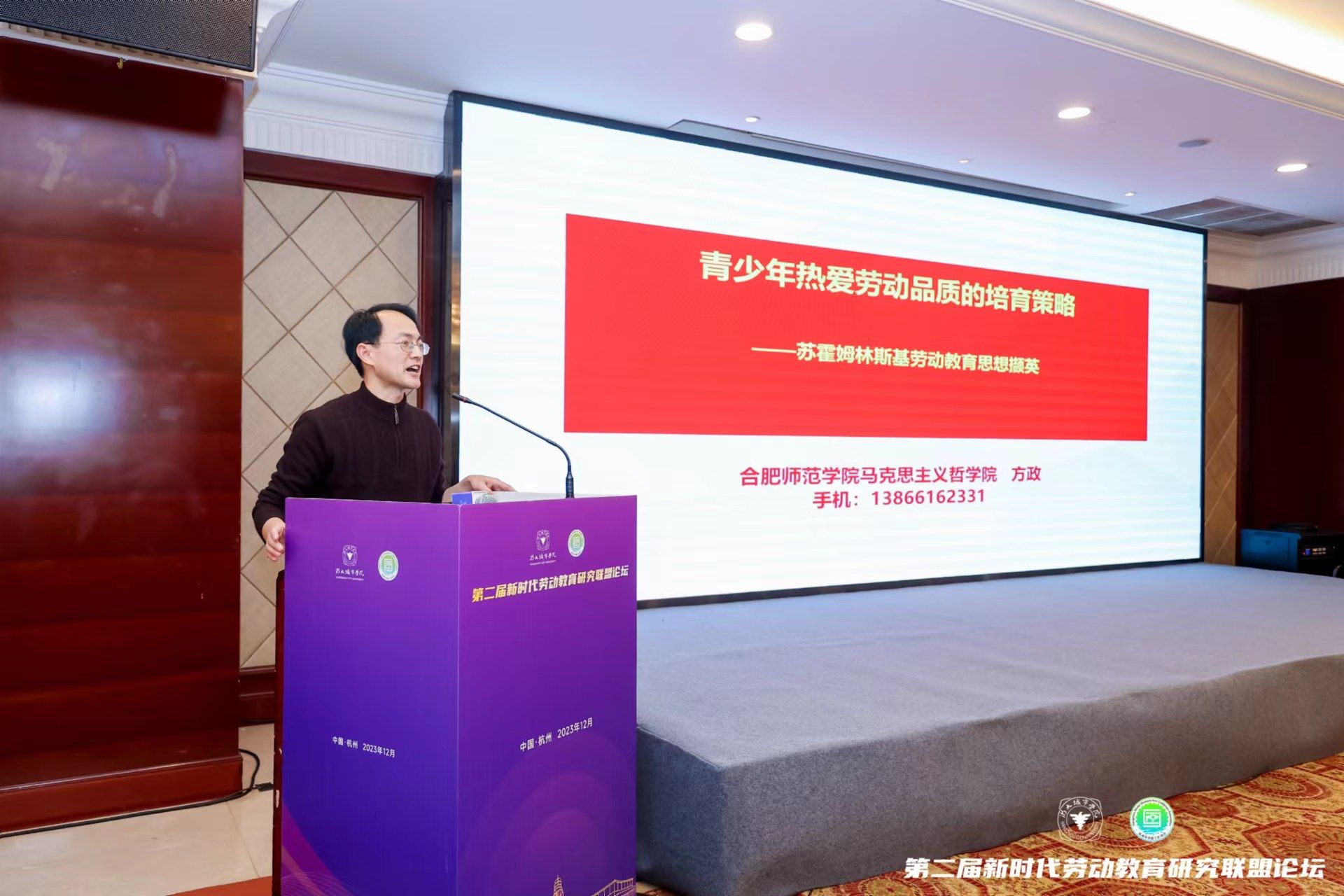 2023年12月26日,由浙大城市学院主办,杭州新时代劳动教育研究联盟、杭州市劳模工匠协会协办的第二届新时代劳动教育研究联盟论坛学术会议在杭州举办。来自中国科学技术大学、大连理工大学、浙江大学、上海对外经贸大学、安徽师范大学、上海师范大学、中国劳动关系学院等全国12个省市的近百名劳动教育专家、青年学者、一线教师汇聚一堂,共同探讨新时代劳动教育的理论与实践问题。44118太阳成城集团哲学(原理)教研室方政教授向论坛提交了题为《青少年热爱劳动品质培育策略——苏霍姆林斯基劳动教育思想撷英》论文,应邀在本次学术研讨会上作主题报告。