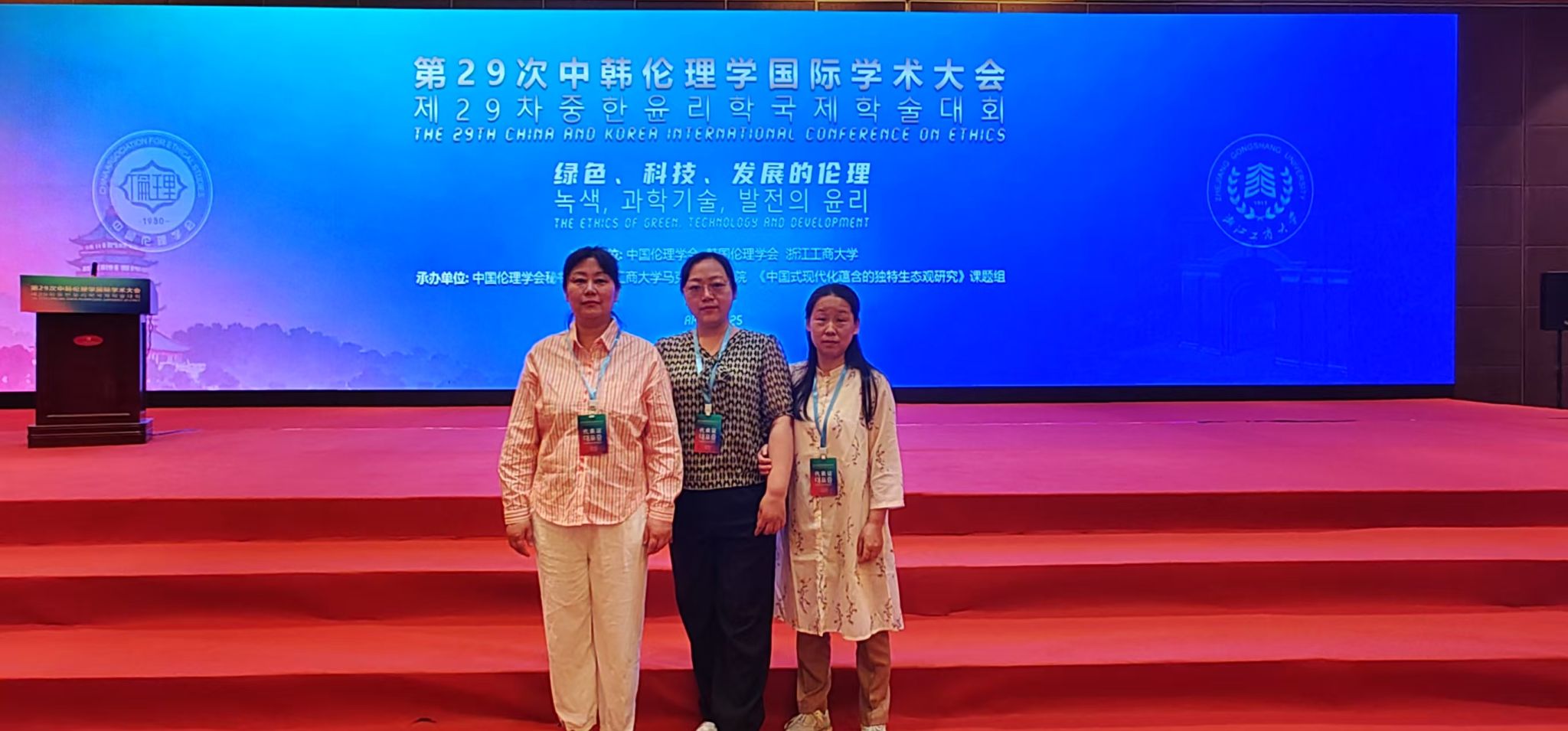 4月18-20日,由中国伦理学会、韩国伦理学会、浙江工商大学共同主办的“第29次韩中伦理学国际学术大会”在浙江杭州举行。大会主题为“绿色、科技、发展的伦理”,来自中国和韩国的伦理学研究者出席会议,以学术研讨、座谈分享等形式展开深入全面的学术交流。应中国伦理学会邀请,44118太阳成城集团教师孙兆静、陶常梅、陈露参加会议。