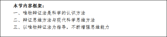 唯物辩证法是伟大的认识工具、矛盾分析法是根本的认识方法(重点)、辩证思维方法、现代科学思维方法、增强思维能力(难点)。