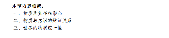 物质、物质的存在方式、物质决定意识、意识对物质的反作用(重点)、主观能动性和客观规律性的统一(难点)