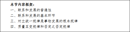 事物的普遍联系、事物的永恒发展、矛盾的同一性和斗争性及其在事物发展中的作用(重点)、矛盾的普遍性和特殊性及其互相关系(难点)、事物发展过程中的量变和质变及其互相转化、事物发展过程中的肯定和否定及其互相转化。