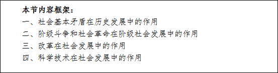 社会基本矛盾在社会发展中的作用(难点)、阶级斗争和社会革命在阶级社会发展中的作用(重点)、改革在社会发展中的作用、科学技术在社会发展中的作用。