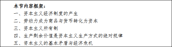 资本主义生产关系的产生、资本的原始积累、资本主义生产方式的确立、劳动力成为商品的条件、劳动力商品的特点与货币转化为资本、资本主义所有制、剩余价值的生产过程和资本不同部分在剩余价值中的作用、剩余价值生产的两种基本方法(重点)、资本积累、工资与剩余价值的分配、资本主义的基本矛盾与经济危机(难点)。