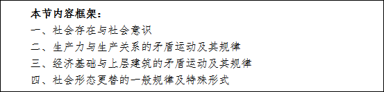 社会存在、社会意识、社会存在与社会意识的辩证关系、生产力与生产关系、生产关系一定要适合生产力状况的规律、经济基础与上层建筑、上层建筑一定要适合经济基础状况的规律(重点)、社会形态更替的一般规律及特殊形式(难点)。