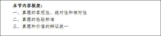 真理的客观性、真理与谬误、实践是检验真理的唯一标准(重点)、价值及其特性、价值评价及其特点、评价评价的功能与树立正确价值观的意义(难点)、真理与价值在实践中的辩证统一。