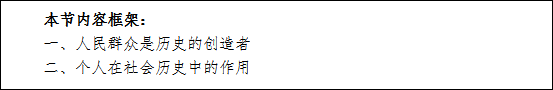 两种历史观在历史创造者问题上的对立、现实的人及其活动是社会历史存在和发展的前提、人民群众在创造历史过程中的决定作用(重点)、无产阶级政党的群众路线(难点)。