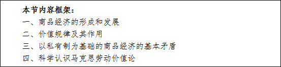 商品经济产生的历史条件、商品的二因素和生产商品的劳动的二重性、商品价值量的决定、价值形式的发展和货币的产生、价值规律及其作用(重点)、以私有制为基础的商品经济的基本矛盾(难点)。