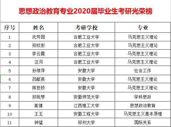 员工管理 当前位置: 主页 >> 备份资料 >> 员工管理 >> 正文 思想政治教育专业2020届毕业生考研光荣榜 发布日期:2020-11-30 编辑:44118太阳成城集团 核稿: 终审:刘艳 点击: